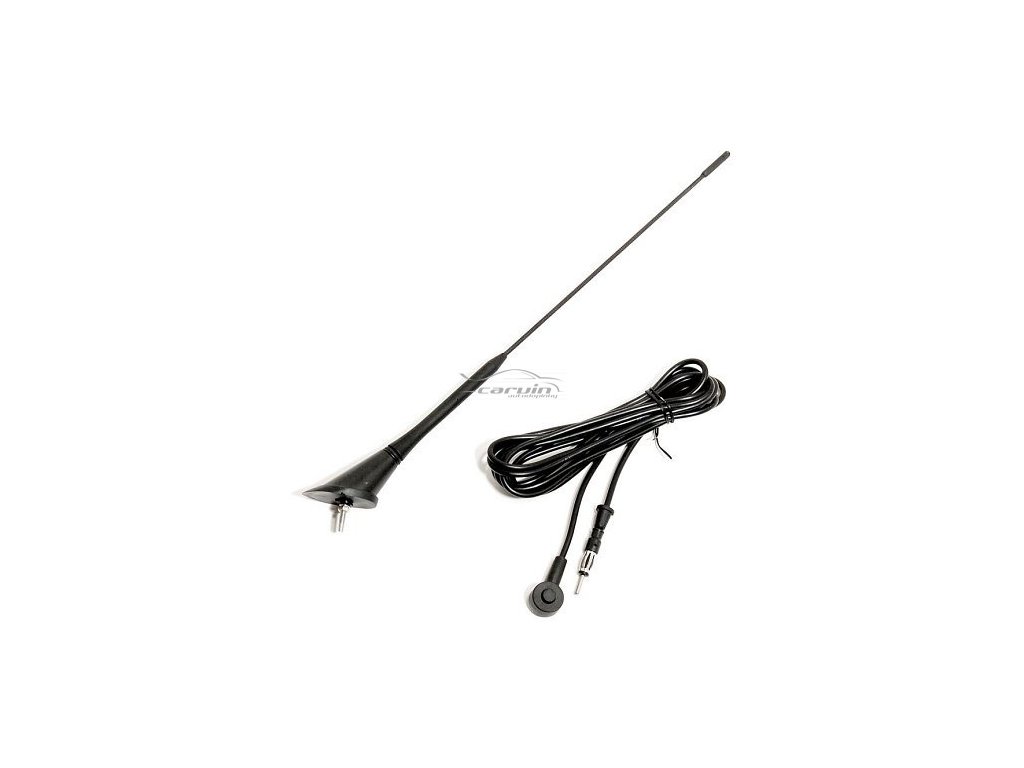 Prutová střešní laminátová anténa určená pro příjem rozhlasového signálu v automobilu, složená ze šroubovacího prutu, upevňovací patice a přívodního kabelu. Délka prutu 40 cm, délka kabelu 330cm, sklon antény 52°.