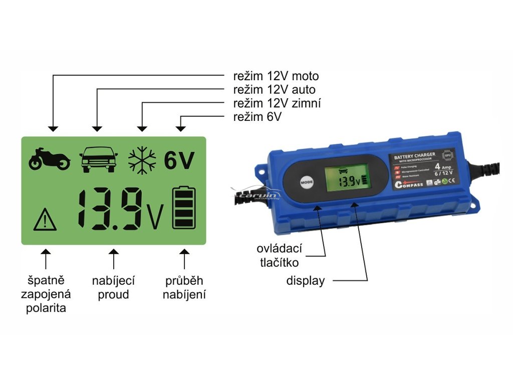 Autonabíječka automaticky rozpozná, je-li připojen 6V nebo 12V akumulátor. Při zapojení 12V akumulátoru lze tlačítkem zvolit různé režimy nabíjení (režim šetrného nabíjení, standardní režim a zimní režim).