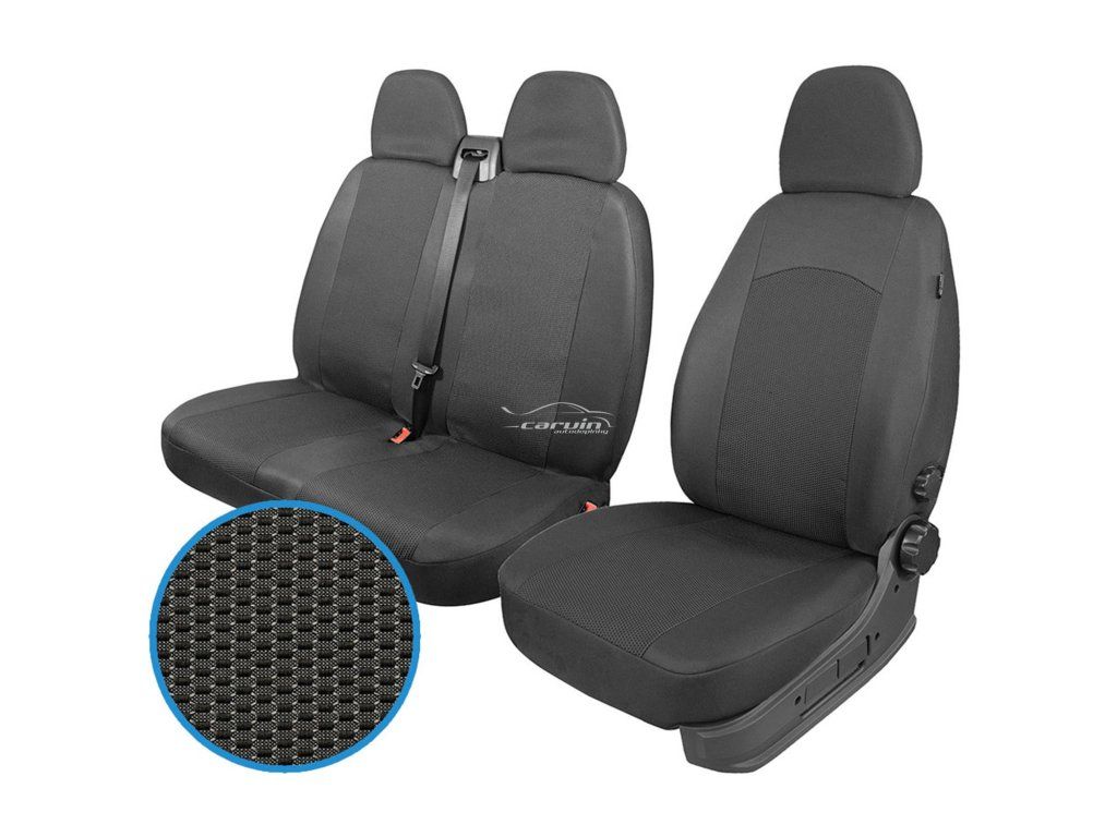 Opěradlo a sedadlo řidiče, 2 loketní opěrky, opěrka hlavy. Dvojopěradlo spolujezdců se stolkem, otvorem pro pásy, 2 opěrky hlavy. Dvojsedák spolujezdců dělený napůl.