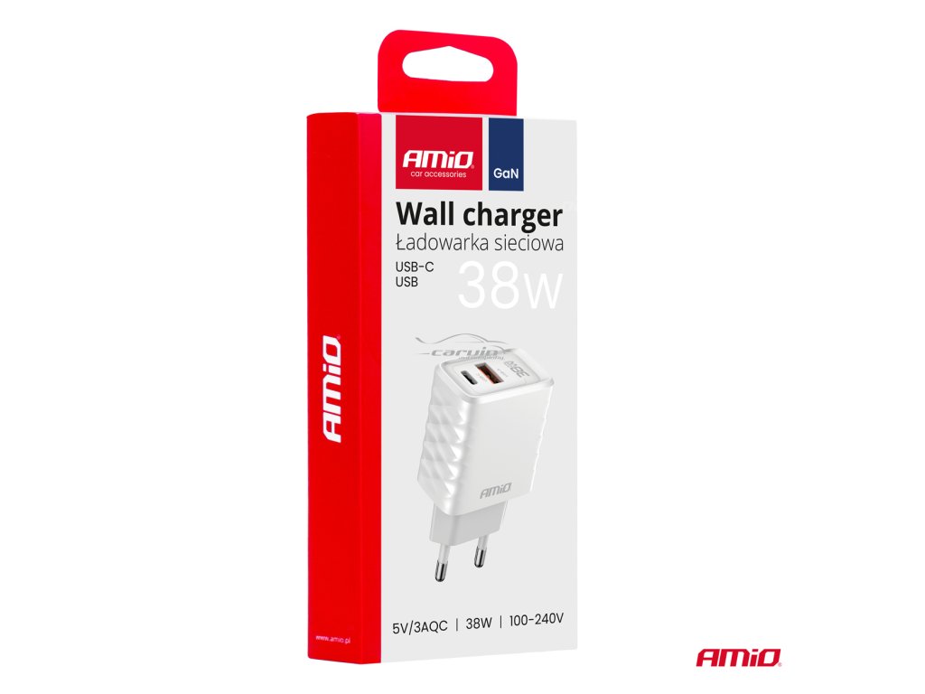 Kompaktní síťová nabíječka AMiO 38 W s technologií GaN, porty USB-A + USB-C, podpora rychlého nabíjení, ideální pro domácnost i cestování.
