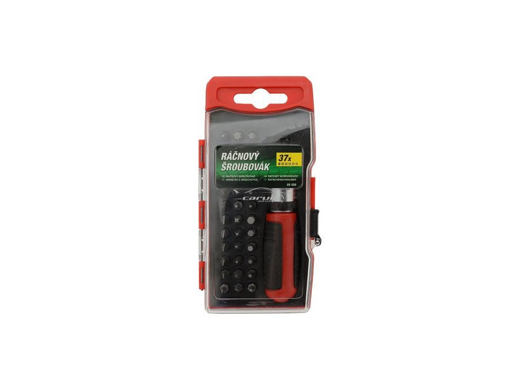 Sada s ráčnovým šroubovákem a celou řadou bitů.
