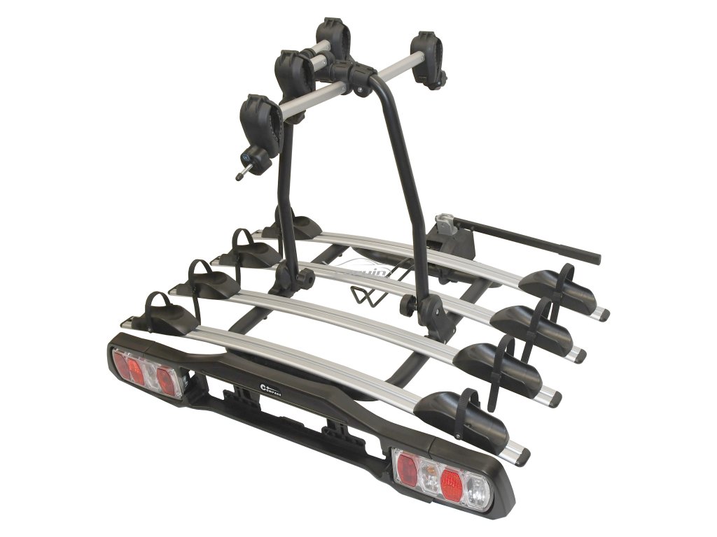 Univerzální nosič na 4 jízdní kola s jednoduchým systémem upevnění, sklápěním pro přístup do kufru, s kompletně osvětleným panelem a místem pro SPZ.