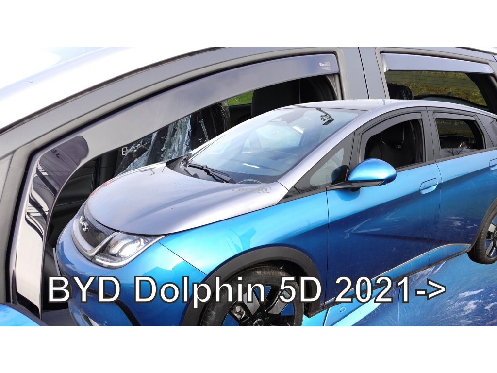 Ofuky - deflektory pro automobil BYD Dolphin . Sada obsahuje 4ks přesných ofuků na přední a zadní okna vč. sady montážních plíšků ( pozn. není u každého modelu podmínkou).