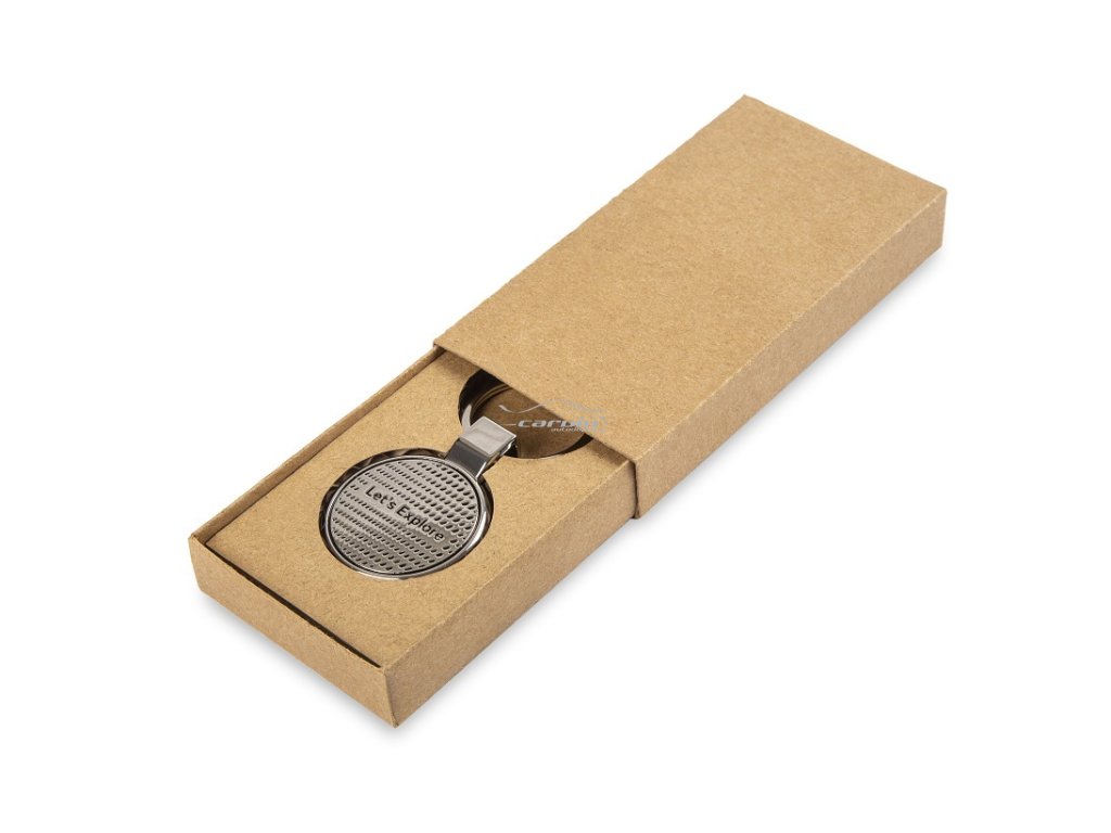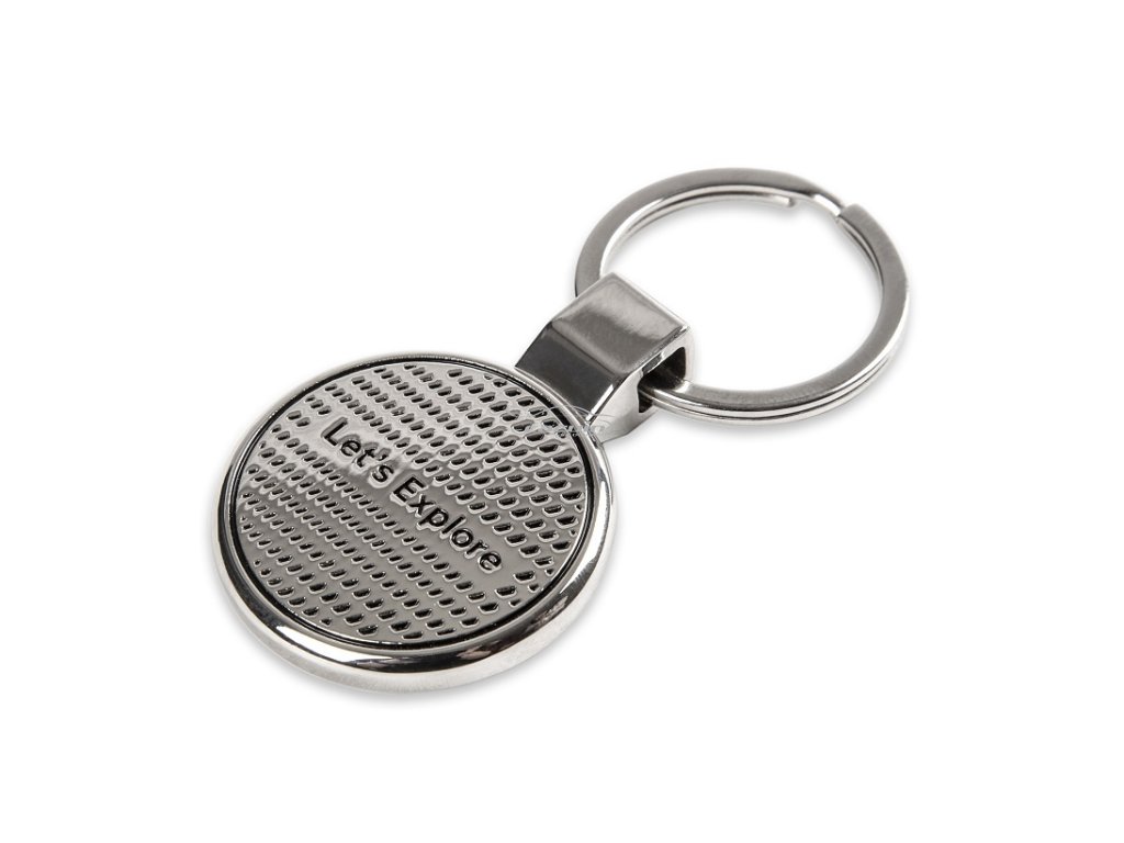 Kovová klíčenka s žetonem, vygravírovaný nápis Let's Explore.
