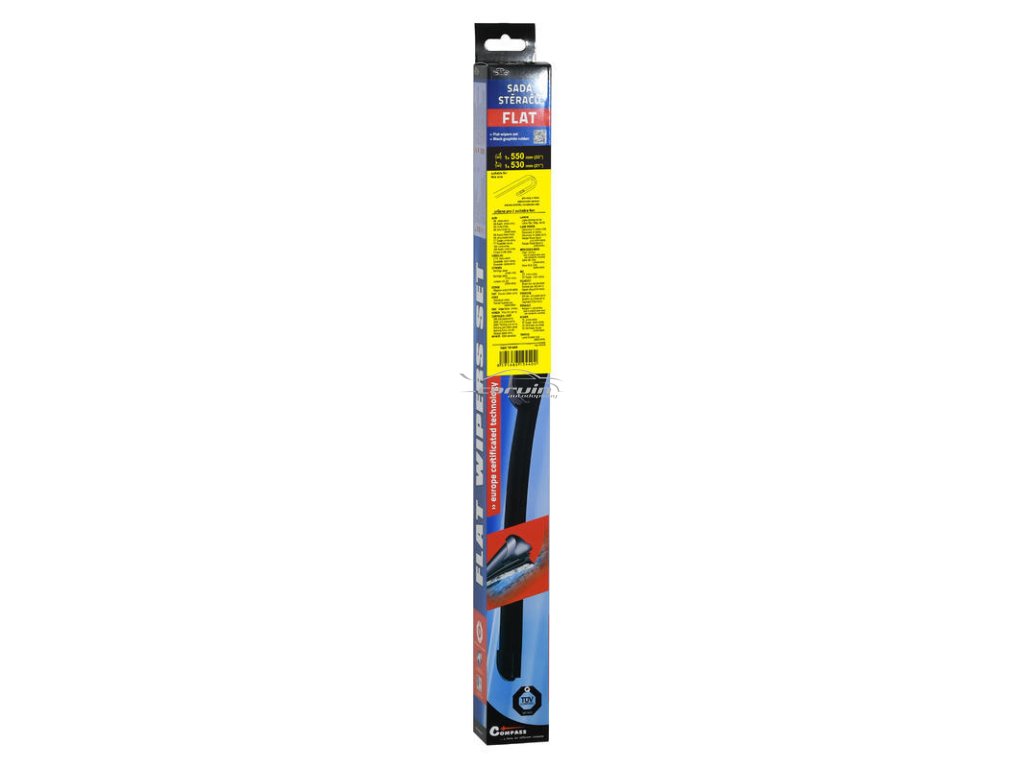 Sada Flatstěračů se skládá ze 2 kusů stěračů řidič + spolujezdec,v patřičných délkách, jejichž součástí je i upnutí - adaptér pro zvolený model vozu.