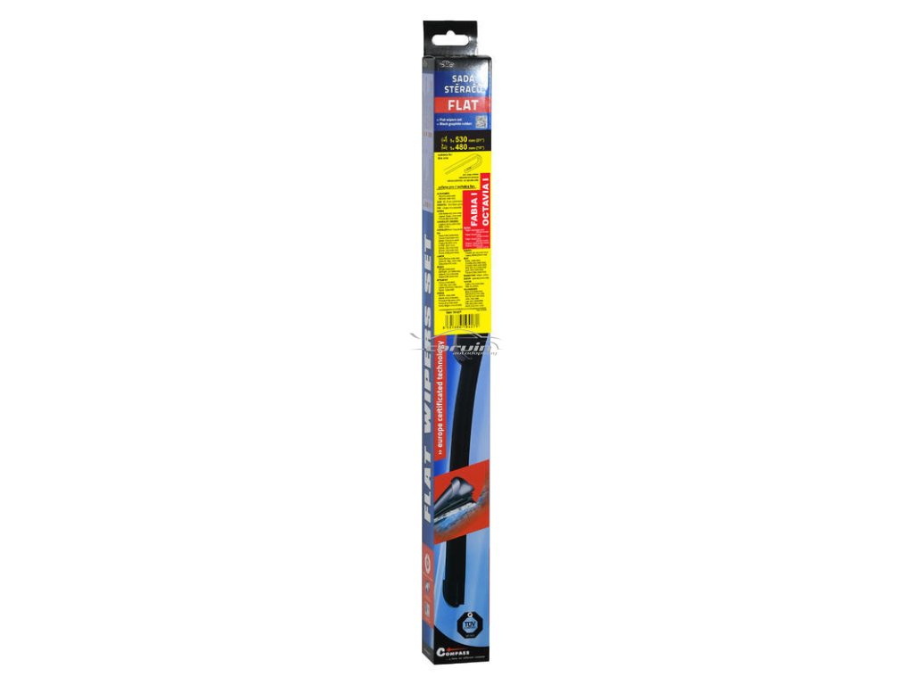 Sada Flatstěračůse skládá ze 2 kusů stěračů řidič + spolujezdec,v patřičných délkách, jejichž součástí je i upnutí - adaptér pro zvolený model vozu.
