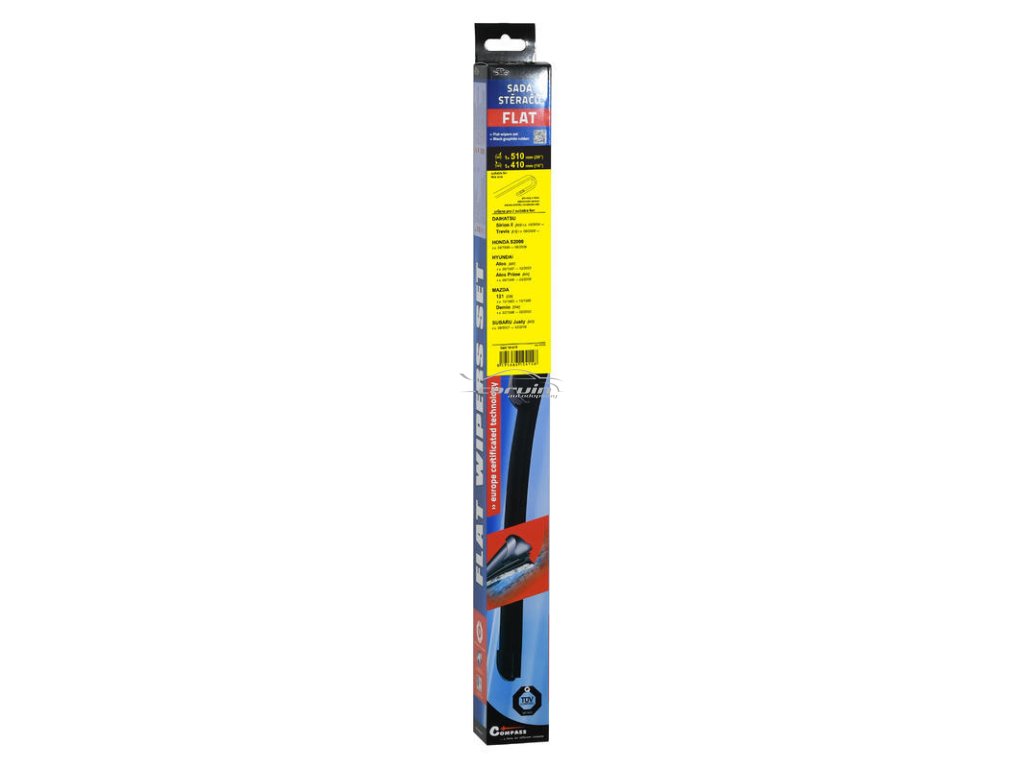 Sada Flatstěračůse skládá ze 2 kusů stěračů řidič + spolujezdec,v patřičných délkách, jejichž součástí je i upnutí - adaptér pro zvolený model vozu.