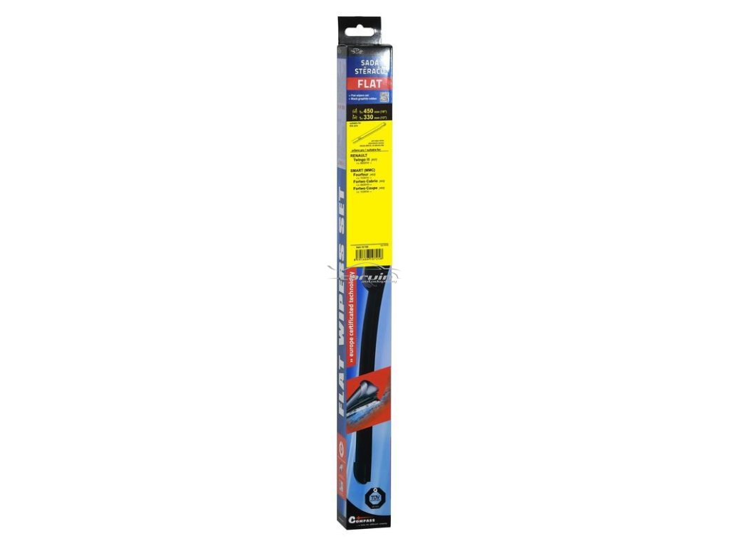 Sada Flatstěračů se skládá ze 2 kusů stěračů řidič + spolujezdec,v patřičných délkách, jejichž součástí je i upnutí - adaptér pro zvolený model vozu.