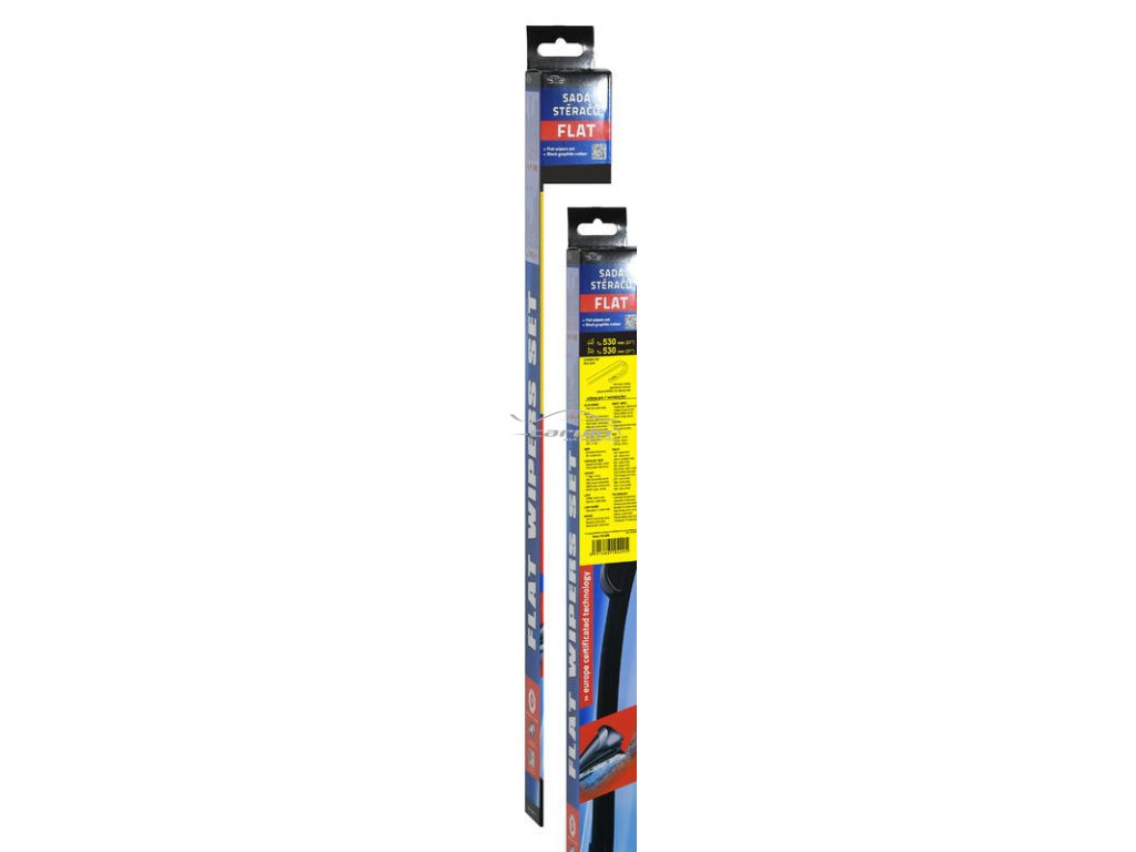 Sada Flatstěračůse skládá ze 2 kusů stěračů řidič + spolujezdec,v patřičných délkách, jejichž součástí je i upnutí - adaptér pro zvolený model vozu.