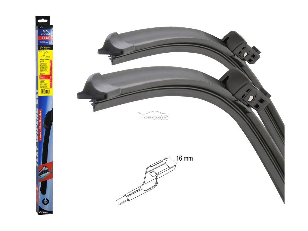 Sada Flat stěračů se skládá ze 2 kusů stěračů řidič + spolujezdec, v patřičných délkách, jejichž součástí je i upnutí - adaptér pro zvolený model vozu.